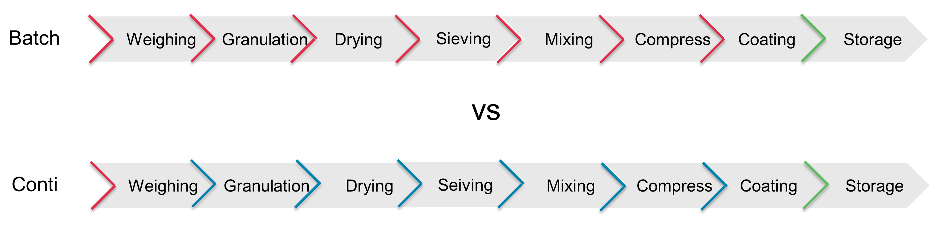 A new trend runs parallel with closed processes - the continuous production of tablets. This process boasts advantages, including production efficiency and a reduced good manufacturing practice (GMP) footprint as it requires a smaller area for setting up a process in a factory. In this manufacturing process, all processes are carried out, including automatic weighing, granulation, drying, mixing of binders, tabletting and coating in a closed system in the same room or process plant. Compared with batch production, this can reduce the required production space by up to 70%.